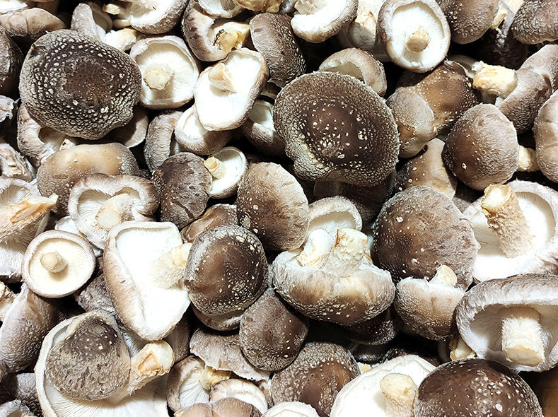 Shiitake mushrooms are best suited for cooked applications such as frying, sautéing, boiling, steaming, and grilling. Although Shiitake mushrooms are a cultivated variety, their umami, earthy flavor and texture lend itself to be a substitute in recipes calling for wild mushrooms. They can be sliced and used in stir-fries, miso soup, vegetarian dashi, stuffed and steamed, cooked in omelettes, mixed into pasta, or fried. They can also be dried and re hydrated for extended use or dried and ground into a powder as a flavouring agent for soups, stocks, and sauces. Shiitake mushrooms pair well with marjoram, thyme, cilantro, spinach, mustard greens, eggplant, broccoli, peas, ramps, carrots, bell pepper, baby corn, water chestnuts, potatoes, onion, green onion, garlic, ginger, poultry, pork, lamb, shrimp, rice, barley, pasta, soy sauce, and dry red wine. They will keep 1-2 weeks when stored in a paper bag in the refrigerator.